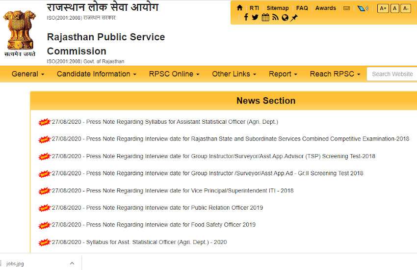 राजस्थान अधीनस्थ सेवाएं के पदों हेतु 560 अभ्यर्थियों के साक्षात्कार 05 अक्टूबर से 23 अक्टूबर 2020 तक आयोजित किये जाएंगे।