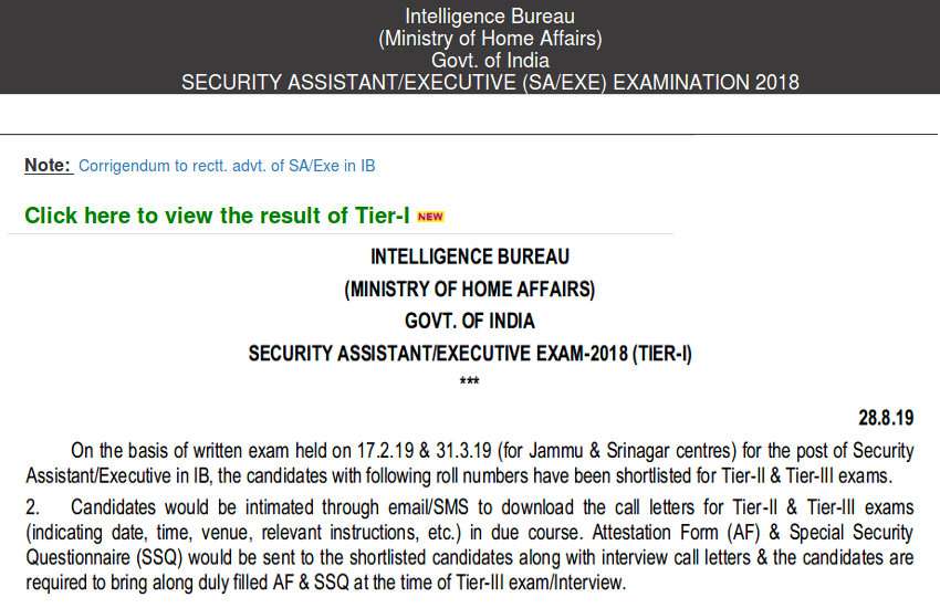 MHA IB Security Assistant Result 2019 जारी, एक ही क्लिक में सीधे यहां से करें डाउनलोड