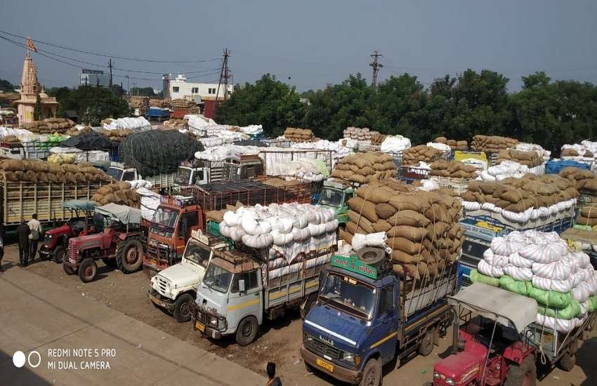 राजकोट. राजकोट बेडी मार्केट यार्ड में पिदले करीब 10 दिनों से मूंगफली की खरीदी बंद होने के बाद गुरुवार को खरीदी शुरू हुई तो वाहनों की कतार लग गई। मूंगफली लदे वाहनों की लंबी कतार लगभग तीन किलोमीटर लग लग गई। बाजार भाव से अधिक कीमत मार्केट यार्ड में होने से यह कतार बढ़ती जा रही है। इस साल मानसून के बाद बारिश होने से मूंगफली की फसल को व्यापक क्षति पहुंची थी।